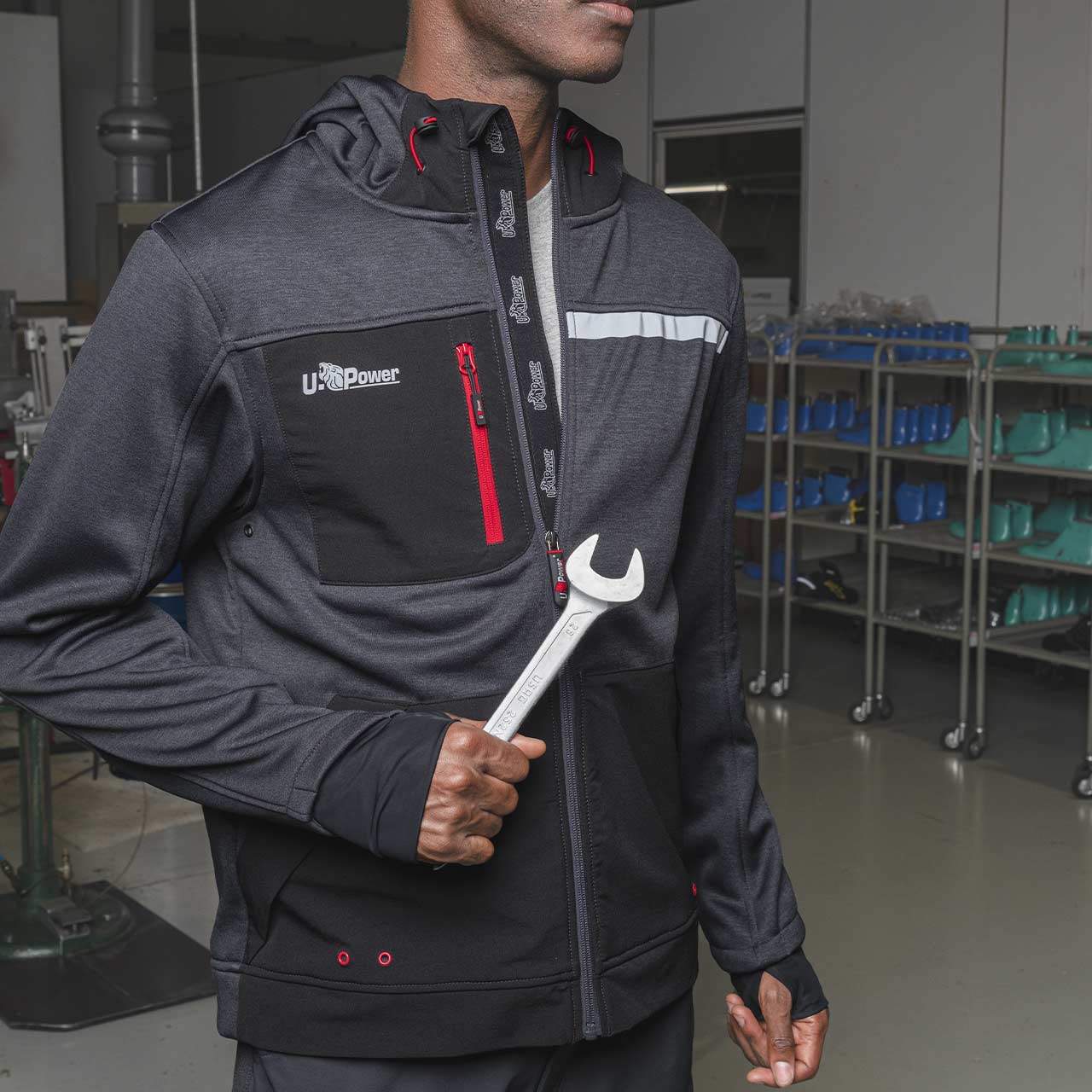 Banda Reflex e Stampa Logo Reflective: Le bande reflex sul petto e sul cappuccio, insieme alla stampa logo reflective "U-Power" sul lato destro del petto, migliorano la visibilità e aggiungono uno stile distintivo alla felpa.