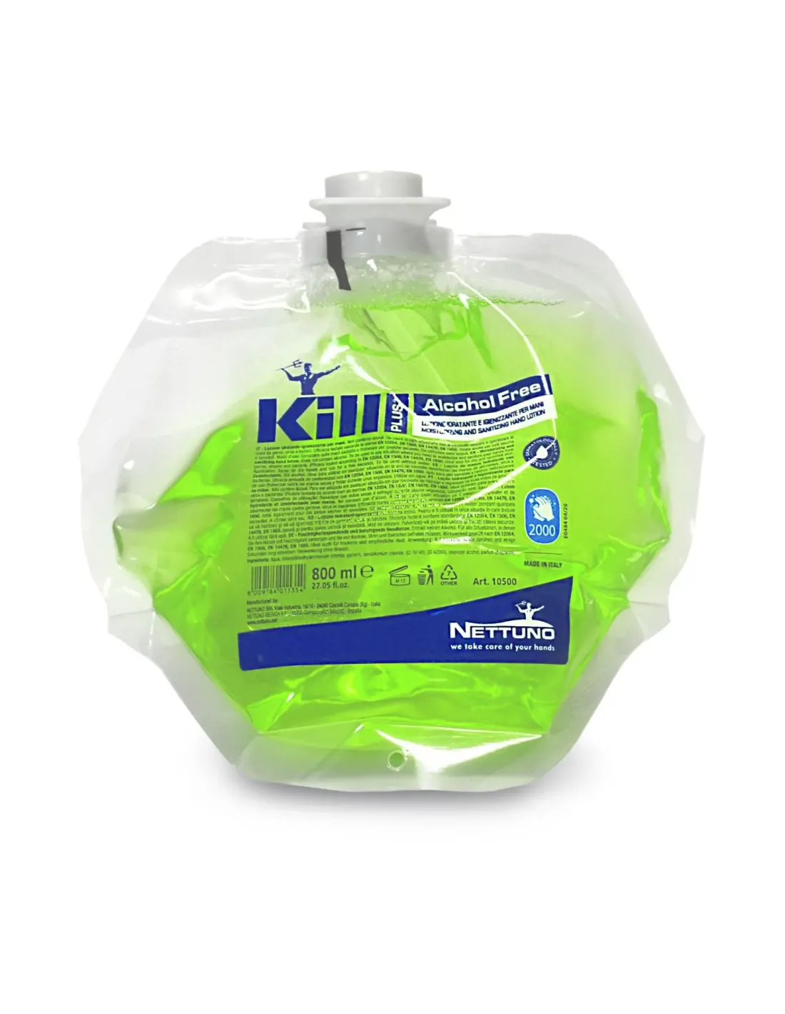 Dermatologicamente testato e Ideale per qualsiasi ambiente, scuole, ospedali, esercizi pubbilci, comunitè ove si necessita di un igiene totale da batteri e virus. Kill plus è una lozione spray sanitizzante. Igienizza e sanitizza senza usare l'acqua. Basta spruzzare il prodotto sulle mani e frizionarlo per qualche secondo. Nonostante non contenga Alcool la sua efficacia è testata secondo le norme EN 12054, UNI EN 1500, UNI EN 14476. Composizione del prodotto: Aqua, didecyldimethylammonium chloride, glycerin, benzalkonium chloride, (CI 19140), (CI 42090), propan-2-ol. Caratteristiche chimico-fisiche: Aspetto : liquido Colore : verde Profumo : inodore pH : 5.5 +/- 0.5 Peso specifico : 1000 +/- 10 g/l