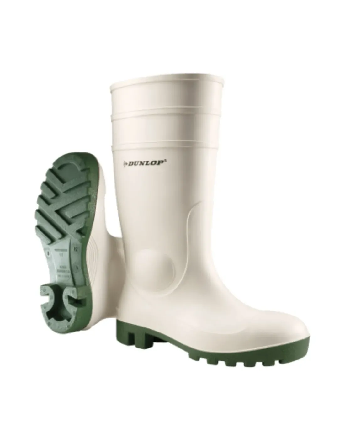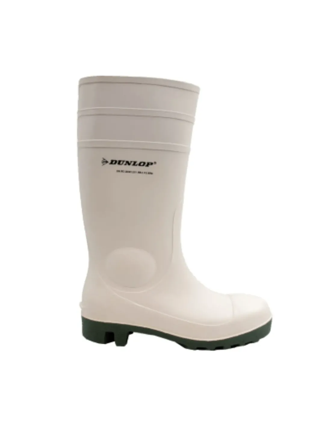 Stivale Dunlop Promastor bianco S4 con puntale in acciaio senza lamina antiperforazione particolarmente indicato per l'industria alimentare. Certificato secondo gli standard di sicurezza europei UNI EN 20345:2011 SB E FO SRA La suola antiscivolo è certificata SRA